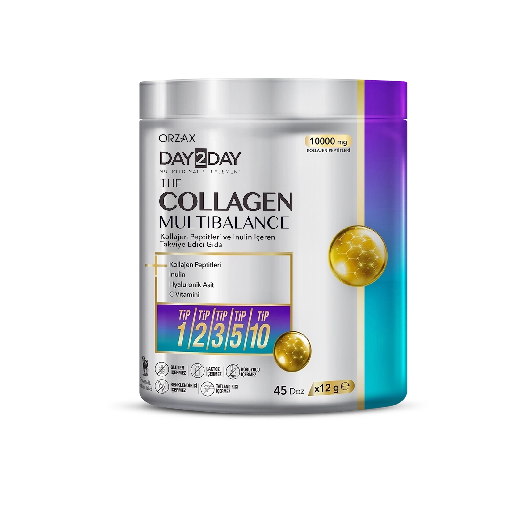 Day2Day The Collagen Multi Balance, Tip 1, 2, 3, 5 ve 10 kolajen peptitlerine ek olarak, prebiyotik lif kaynağı İnulin, Hyaluronik Asit ve C vitamini ile etkisi güçlendirilmiştir.